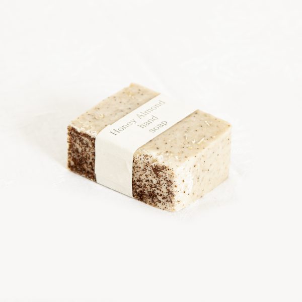 Cold process hand soap. Low scent. Contains tallow, vegetable shortening, coconut oil, water, lye, beeswax, oatmeal, honey, spearmint essential oil.